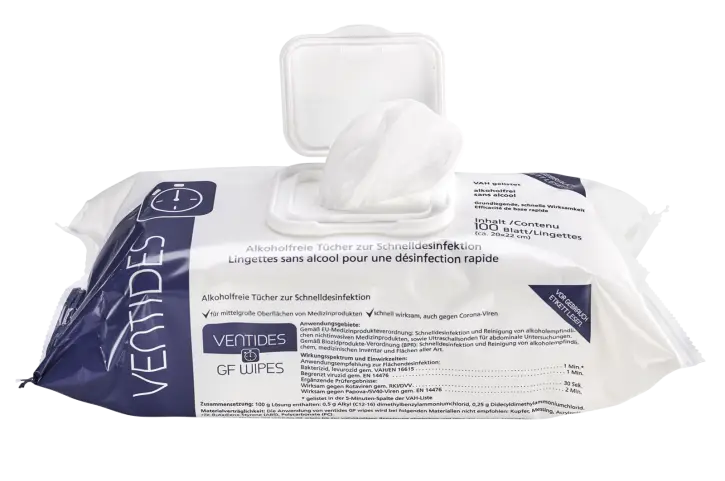 Ventides GF wipes bieten bei der Desinfektion und Reinigung von mittelgroßen Flächen eine universelle und zeitsparende Anwendung. Sie sind alkoholfrei und enthalten weder Aldehyde noch Phenole. Die Tücher lassen sich einzeln aus der praktischen Packung mit wiederverschließbarem Deckel entnehmen.